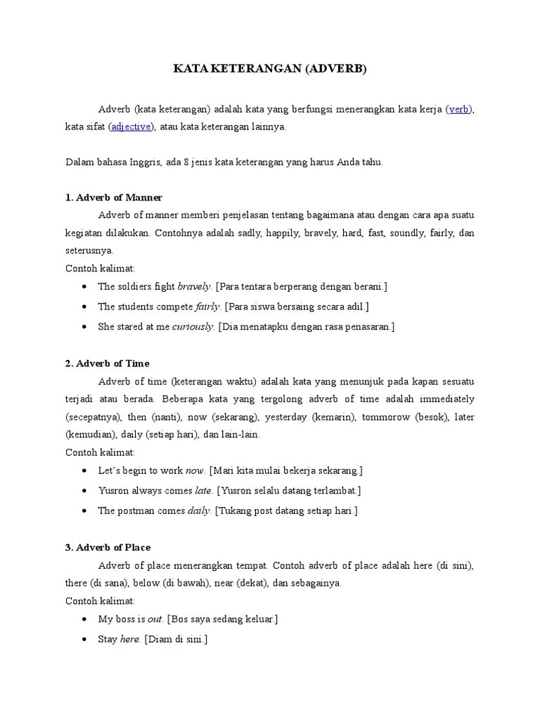 Kapan sesuatu terjadi (when it happened). Jenis kata ini menjadi keterangan yang merujuk waktu (when), tempat (where), dan bagaimana (how). Contoh kalimat adverb of time. Jawaban · 1) after = setelah · 2) always = selalu · 3) before = sebelum · 4) during = selama · 5) lately = belakangan ini · 6) never = tidak pernah · 7 . ' berdasarkan posisi, penulis menemukan bahwa kata keterangan frekuensi bahasa.